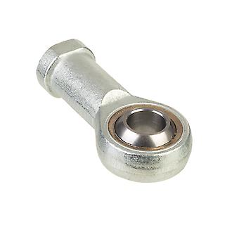 A rod end bearing, also known as a heim joint (N. America) or rose joint (U.K. and elsewhere), is a mechanical articulating joint. Such joints are used on the ends of control rods, steering links, tie rods, or anywhere a precision articulating joint is required, and where a clevis end (which requires perfect 90 degree alignment between the attached shaft and the second component) is unsuitable. A ball swivel with an opening through which a bolt or other attaching hardware may pass is pressed into a circular casing with a threaded shaft attached. The threaded portion may be either male or female.Specifications Lubricant: Maintenance free dry lubrication. Design: Steel/PTFE sintered bronze. Bore diameter d: 8mm. Diameter head d2max: 25mm. Width inner ring B: 8mm. Thread G6H: M 8. Width head C1max: 6.5mm. Height shank end face - centre rod end eye h1: 36mm. Angle of tilt : 15. Raceway diameter inner ring dk: 13mm. Diameter shank d4: 13mm. Length threat l3min: 15mm. Length (height) housing l4max: 50mm. Length wrench flat l5: 9mm. Distance shank chamfer - centre rod end eye l7min: 11mm. Size wrench wh14: 11mm. Thickness shank base for clamping bolts N1max: mm. Chamfer dimension bore r1min: 0.3mm. Basic dynamic load rating C: 5.9kN. Basic static load rating C0: 12.9kN. Specific dynamic load factor K: 100N/mm. Material constant KM: 1400.