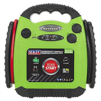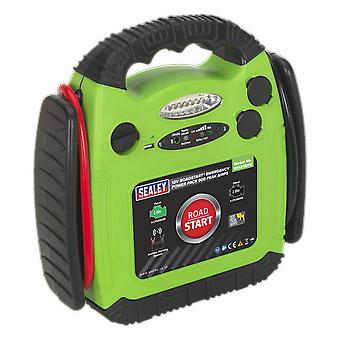 Features: Composite hi-vis green case with moulded rubber protection, integral battery cable storage and carry handle. LED Battery condition, polarity check, with audible warning if polarity is reversed, and charge indicators. Features independent on/off switch which allows the positive clamp to be connected without the risk of sparking and an integral LED work light for use at night. Fitted with two 12V power sockets that will accept any 12V device fitted with a vehicle accessory socket plug. Also features a USB outlet (5V/1A). Specifications: Model No: RS1312HV. Cold Cranking Amps: 400A. Peak Amps: 900A. Voltage: 12V. Auxiliary Output: USB - 5V/1A, 2 x 12V Port. Cable & Clamp Length: 725mm. Weight: 6.6kg.