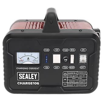 Features: Supplied in steel case with carry handle, this single phase charger features plenty of ventilation to help maintain low transformer temperatures. A large ammeter displays rate of charge and a dash-mounted fuse provides polarity protection in the event that clips are connected incorrectly. Rocker switches control variable output to the battery to maintain peak condition. Suitable for regular and low maintenance batteries. Supplied with 2200mm length output cables with heavy-duty crocodile clips and is fitted with ASTA/BS approved non-rewirable 3-pin safety plug.Specifications: Model No: CHARGE106 Output: 12/24V Output Charge Peak(EN): 8A(6A) Battery Range: 10-95Ah Input Charge: 0.4A Charging Rates: 2 Supply: 230V Polarity Protection: Fuse (1 x 15A) Fuse: SBF1550 (Pack of 50), CHARGE106.07 (Single) Height: 200 Width: 266 Length: 210