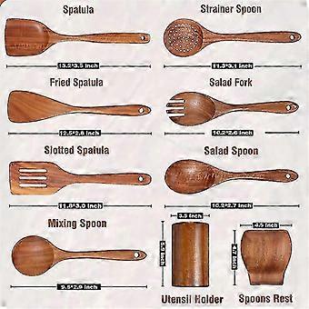 [Wooden Spoon Holder & Spoon Rest]In with others, wood spoon comes with a spoon rest and a holder so you can rest and your spoons and spatulas on your counters during cooking and after cooking. There is a leak hole at the bottom of the spoon holder, so ´t worry about water accumulation.HEAT-RESISTING :This wooden cooking utensils can withstand safe up to 450 degrees, so you ´t need to worry it will melt or scald your hands.HARD&BEST FOR PAN:Teak wood is -grained with high oil which is known for being one of the hardest. You ´t have to worry about it falling on the ground and breaking or scratching;This durable teak wooden spoon can prevent expensive non-stick pans from scratch and damage.[9-Piece Kitchen Utensils Set]A complete wood kitchen utensils that features all the cooking tools including a flat spatula, fried spatula, slotted spatula, kitchen utensil holder, spoons rest, strainer spoon, salad fork, salad spoon, mixing spoon. Covers all your kitchen needs from stirring to cooking.color:Wood colorMaterial:woodenPackage Contents:9 x Wooden SpoonsOnly the above package content, other products are not included.Note: Light and different displays may cause the color of the item in the picture a little different from the real thing. The measurement allowed error is +/- 1-3cm.