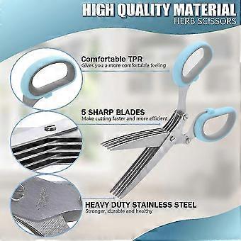 Widely Used- This herb scissors with 5 blades and cover can be used to cut mint, herbs, onions, seaweed, coriander, dried peppers, basil, chives, rosemary, sage, cilantro in perfect size onto plates quickly. Also great for paper cutting.Save Time and Hassle- Herb Cutting Scissors allow you to cut and mince fresh herbs, basil or chives directly into any dish without the tedious work. With the sharp, finely balanced 5 blades equals 10 knife chops can greatly improve your cooking efficiency. No more cleaning knives and cutting boards.Easy to Use&Clean- Our herb shears equipped with a cleaning comb for you to clean the scissor. Just quick swipe with the cleaning comb, and the herbs attached to scissors can fall off quickly. Hate cleaning? Just rinse the blades and wash the herbs scissors in your dishwasher.Premium Material- The high-quality stainless steel construction and the non-slip ergonomic TPR handle give you a comfortable grip and great control. The herb scissors are lightweight and wear-resistant. Makes your grip more comfortable and reduces the fatigue of using scissors Perfect for feasting and helping kids with the latest masterpiece.Perfect Gift - The salad scissors are simple to use and makes the cooking process easier. It is a good gift for mothers, wives and even food lovers on any occasion. So that everyone can enjoy the fun and charm of cooking.