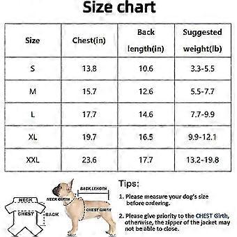 Size:S--Back Length 27cm, Chest 35cm, Fit for 1.5-2.5kg dog.Size:M--Back Length 32cm, Chest 40cm, Fit for 2.5-3.5kg dog.Size:L--Back Length 37cm/14.6", Chest 45cm/17.7", Fit for 3.5-4.5kg/7.7-9.9lb dog.Size:XL-Back Length 42cm, Chest 50cm, Fit for 4.5-5.5kg dog.Material: This dog raincoat is made of Polyester material, the waterproof dog raincoat will keep your dog dry and comfortable on a rainy day, no more worries about dog cleaning. And the part of the hat is transparent EVA material, even if it rains, it will not block the pet´s sight.Fashion Design:Our raincoats come with rain boots to avoid wet feet. With button design and removable tail sleeve, easy to wear and take off, keep your pet dry and clean. Four-leg raincoat conforms to the body of dogs while preventing water from entering, and the bright colors and Jacket style make your puppy cooler and cuter.Waterproof: The dog poncho that is water resistant and will keep your dog safe and dry in all weather conditions. We used high quality 100% polyester material. The inner layer will keep your dog warm and outer layer would help you keep your dog dry and secure from cold.Easy to clean: The raincoat for dogs is washable, just use a wrung-out wet cloth to wipe the surface of the raincoat and let it dry naturally. It is also foldable and equipped for trips to the park, beach, or hiking trails.