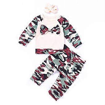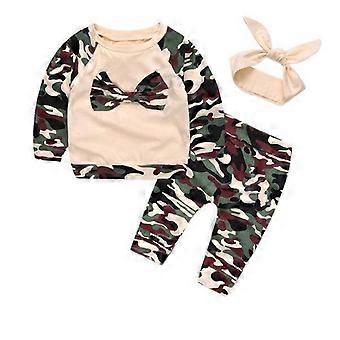 Add a touch of trendy style to your little one`s wardrobe with our Baby Girl Striped Camo Headband Outfit Set. This adorable set is perfect for fashion-forward babies who want to stand out from the crowd.Our Baby Girl Striped Camo Headband Outfit Set is made from cotton fabric, ensuring comfort and durability for your little one`s delicate skin. The set includes a stylish striped top and matching camo pants, creating a fashionable ensemble that will make your baby the center of attention.Designed for both baby boys and girls, this set features a pullover style with a cozy O-neck collar and full-length sleeves to keep your little one warm and snug. The regular sleeve style adds a classic touch to the outfit, making it suitable for various occasions.The broadcloth fabric provides a soft and gentle feel, allowing your baby to move freely throughout the day. The cotton material composition ensures breathability and moisture absorption, keeping your baby comfortable in any weather.With its active and trendy style, this outfit set is perfect for playdates, family outings, or simply lounging at home. The striped pattern adds a fun and playful element, making your baby the most stylish one in the room.Choose our Baby Girl Striped Camo Headband Outfit Set for a reliable, dependable, and honest product that brings both comfort and style to your baby`s wardrobe.