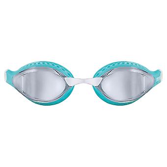 These premium mirrored racing goggles from Arena in silver and turquoise are the ideal companion for competitive swimmers, triathletes and open water swimmers.The innovative air seals are designed to compress and adapt to your face, distributing the pressure only where needed, for a super light feeling. Cool and hydrodynamic design for the best performance. Featuring mirror lenses.The Arena Airspeed goggles come with interchangeable nose pieces so that you are able to get the best fit. The split head band can be quickly adjusted with the easy to use buckle and ensures a solid fit on start and turn.Like all arena goggles, the Airspeed goggles feature UV protection 400 and are PVC free. Features: Premium racing and training goggles Large field of view, low profile, optimal sealing Split head band for solid fit on start and turn UV protection, PVC free Also for triathlon and open water Mirrored lenses Materials: Lens - polycarbonate Seal - TPR Strap - silicone FINA Approved