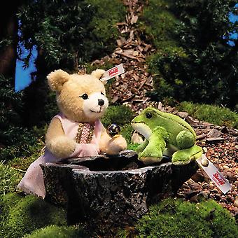 A part of the fairytale limited edition range from Steiff is this lovely Frog prince and princess set. The princess teddy bear and frog are made from high quality wool plush in beige and green respectively. The 5-way jointed teddy bear wear a lovely glittering tulle skirted dress in a dusty pink. The frog is made from a mix of dark green and cream for his belly, and he wears his crown on his head. The princess has black safety eyes and her mouth and nose are also stitched in black, and the prince also has a sitched mouth and nostrils and black safety eyes. The princess measures 15cm in height and the frog prince measures 5cm. As with all Steiff the prince and princess each have a gold-plated button in her ear and his foot respectively, along with white label. This set is a limited edition of only 1000 pieces and comes packaged in a collector´s gift box with numbered certificate of authenticity. This item is suitable for Adult collector´s only and is surface washable with care. Material Composition: 52% Cotton, 48% Wool Always read the full care instructions and safety information on the tag.