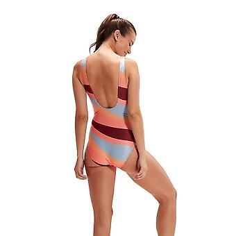 This colourful Speedo Allover U-Back swimming costume is designed with a deep U-back and contrast Speedo logo for a touch of style at the pool and beach. The round neck, U-shaped back and high leg cut provide a fashionable fit, while the ECO EnduraBrite fabric provides excellent colour performance. This Speedo swimsuit is made with ECO Endura Brite fabric which provides superb colour performance. Offering higher chlorine resistance than standard swimwear fabrics, it fits like new for longer with CREORA® HighClo and has been made from 100% recycled materials. Features: Scoop neck and a Deep U-back swimsuit brings a touch of exoticism to the pool and beach. Higher chlorine resistance than standard swimwear fabrics. High colour rendering, allows the use of fluorescent and bright colours. Made from recycled plastic bottles, the fabric yarn is 100% made from post-consumer waste.
