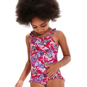 CHECK THE PROVIDED SIZE CHART (in image section above). Sizing is specific to this item and will not correspond with your usual clothing size. Join the all-new Learn to Swim Squad on a magical Bondi adventure Pretty in pinks and purples, this fun Thinstrap Swimsuit is perfect for little swimmers and features Speedos fun-loving new Aria the Otter and Ellie the Elephant characters enjoying a swim down under. Young children will enjoy the frill detailing, while the thin strap design allows them to splash and play without feeling restricted. Ideal for regular pool sessions, Speedo ECO EnduraFlex fabric offers higher chlorine resistance than standard swimwear fabrics and fits like new for longer with CREORA ® HighClo. In addition, nylon yarns in the EnduraFlex fabric are made from 100% pre-consumer waste, such as waste fabric from factories. Key Features: Low Leg Height Front Lined Thinstrap suit - with frill detailing on the shoulder and legs Higher Chlorine resistance than standard swimwear fabrics - fits like new for longer with CREORA ® HighClo Shape Retention - fabric stretches so you can enjoy your swim without feeling restricted Nylon yarns in the EnduraFlex fabirc are made from 100% pre-consumer waste, such as waste fabric from factories Fabric Description: Eco EnduraFlex Fabric Composition: 80% Recycled Nylon, 20% Elastane (CREORA ® HighClo) ]]>