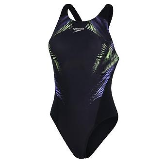 CHECK THE PROVIDED SIZE CHART (in image section above). Sizing is specific to this item and will not correspond with your usual clothing size. Glide through training in the New Speedo Women´s Placement Digital Recordbreaker Swimsuit. This sleek black Recordbreaker swimsuit is ideal for drills and sets, the design includes an open back and straps that sit between the shoulder blades for improved freedom of movement. Designed to be durable and better for the environment, it´s made from Speedo´s new ECO Endurance+ Fabric, which is 100% Chlorine resistant, quick-drying and made using 50% recycled materials. Features: Premium digital placement print Recordbreaker - aids shoulder movement and flexibility Medium leg height 100% Chlorine Resistance Quick Drying Fabric: ECO Endurance+ 53% Recycled Polyester, 47% PBT ]]>