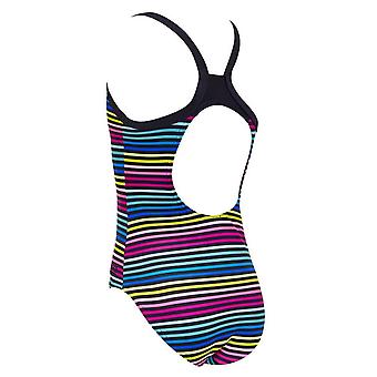 ALWAYS CHECK THE SIZE CHART (IN IMAGE SECTION ABOVE). SIZES PROVIDED ARE UK SIZES, BE SURE TO MEASURE AND CHECK THE SIZE CHART BEFORE ORDERING. Stand out at the pool with the colourful girls Zoggs Flower Tribe Strikeback swimsuit. The Flower Tribe Strikeback swimsuit provides fantastic flexibility with medium width shoulder straps that are comfortable and do not restrict your shoulders. The junior Flower Tribe swimsuit from Zoggs is made with Ecolast fabric it is environmentally friendly, feels awesome, keeps its shape brilliantly and stands up to chlorine, sun cream and oils. Ecolast™ fabric is made with ECONYL® regenerated yarn, which is made from recycled fish nets and other discarded nylons. This product is part of the Zoggs sustainable product program, using recycled materials to help protect our environment for future generations. Features:  Ultra-chlorine resistant  Exceptional resistance to sun cream, oils, sweat and heat . Medium shoulder straps Superior shape retention  Machine washable  Quick drying Front lined for increased modesty