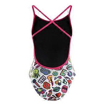The Jaked Crazy swimsuit features a colourful print with music ispired icons it an ideal choice for club and fitness swimmers of all ages. The swimsuit is made with Jaked´s Vita material which is a blend of recycled polyester and extra life lycra to produce a swimsuit with excellent shape retention, longevity and with a smaller environmental impact.The fabric is resistant to the effects of chlorine and UV rays to ensure that your swimsuit retains its vibrancy. Designed with wide elasticated shoulder straps and open back this swimsuit allows for maximum freedom within the shoulder movement allowing a full stretch while hitting even the hardest of training drills. With fast drying and optimal breathability the Crazy swimsuit offers perfect fit and reduced drag for improved glide in the waterFeatures:Medium Leg cut for a perfect balance between modesty, freedom of movement and comfort.Made with recycled Polyester.Quick Drying2 way StretchMaterial : 78% Recycled Polyester - PBT & 22% Extra Life Lycra